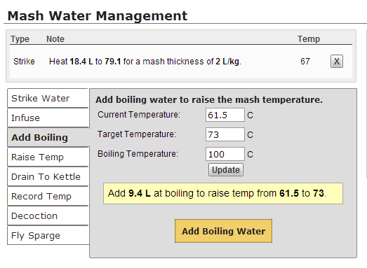 I would like to have had a sparge temp closer to 78-80°C, but had no way of calculating the temperature for 9.2l. of sparge water ahead of time. The Mash and Infusion Calculators here only calculate Xl. of H2O @ 100°C, not Xl. of H2O @ Y°C, where X is variable but pre-defined.