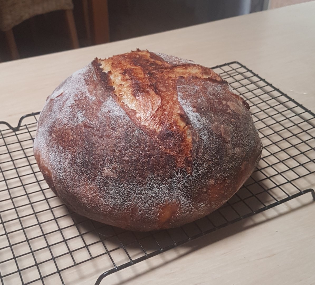 View attachment 12590 With hills on fire to the north and southeast of us, I was hesitant to bake this morning. However, for the time being we are not in danger, so I present my latest sourdough round. I shaped this one better than the last 2.