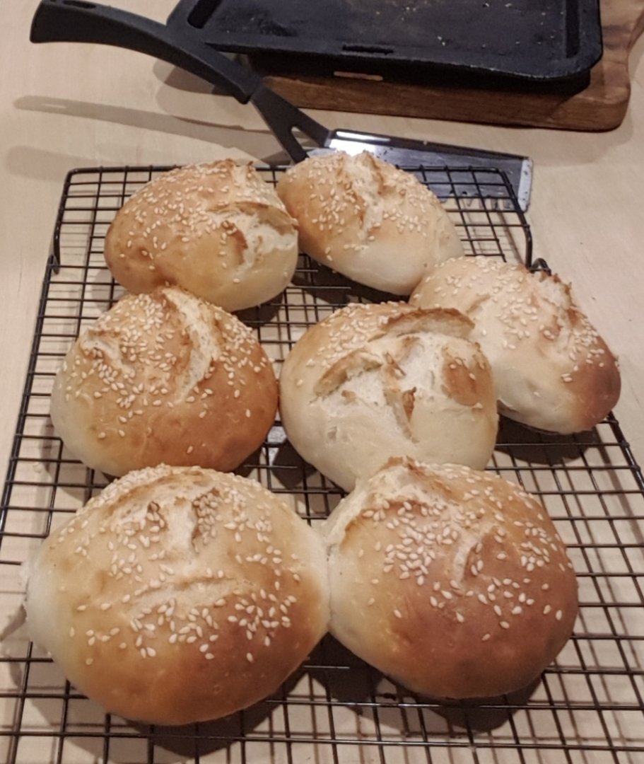 Super easy. 1 hour rise, shape, 10 min proof. 3-5 mins on each side on a griddle, finish in oven for 7-10 mins...I've had 3 so far today. Planning on eggs Benedict tomorrow for brekkieThey look great I was actually looking at having a crack at these yesterday.