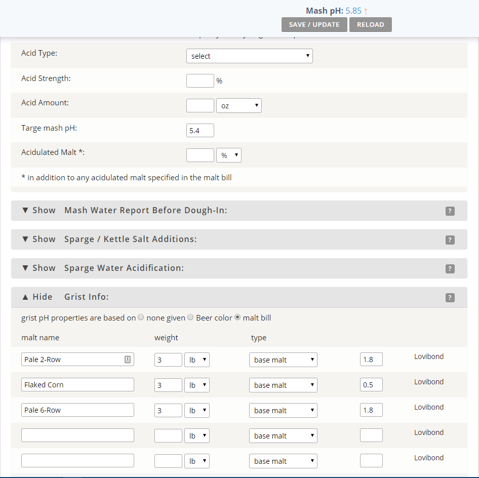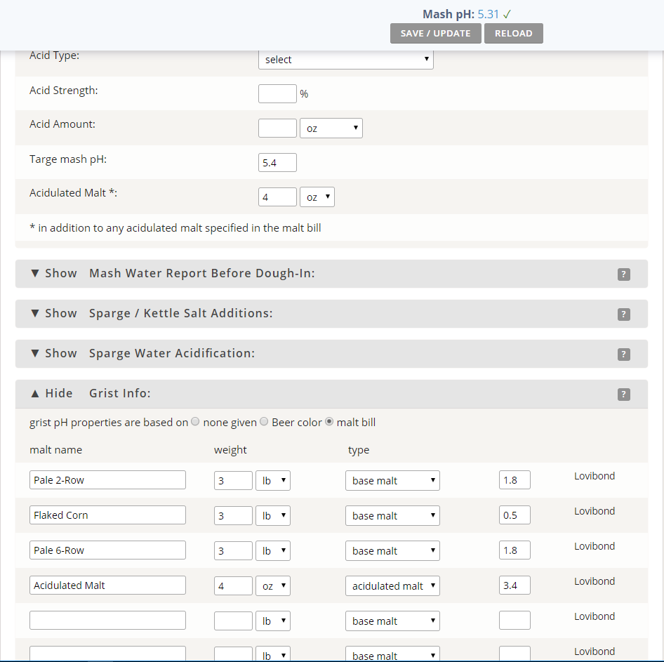 I then updated the recipe and the estimated ph in the recipe is listed at 5.31 rather than 5.58: