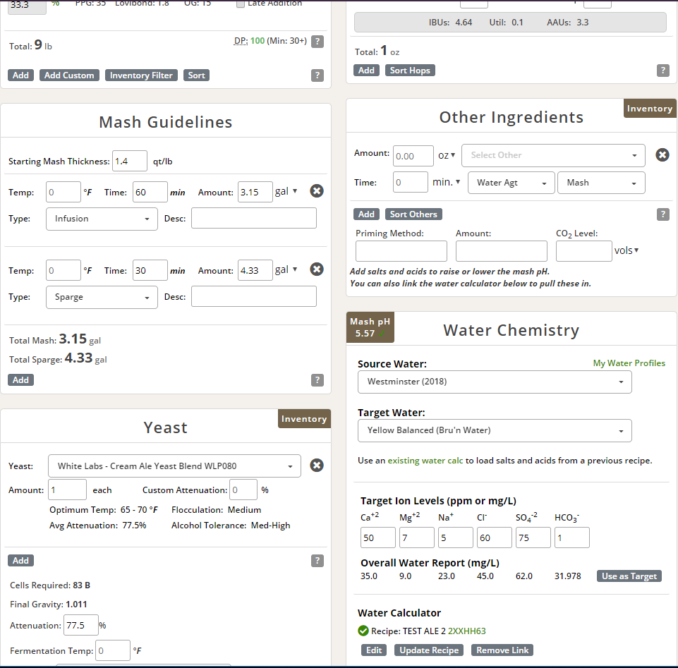 Here is a view of the water calc after I have saved the recipe and created a new water calc. There is 5 oz. of acid malt added in as additional acid malt even though it is listed in the malt bill already, this additional acid malt field was pre-filled when the calc opened: