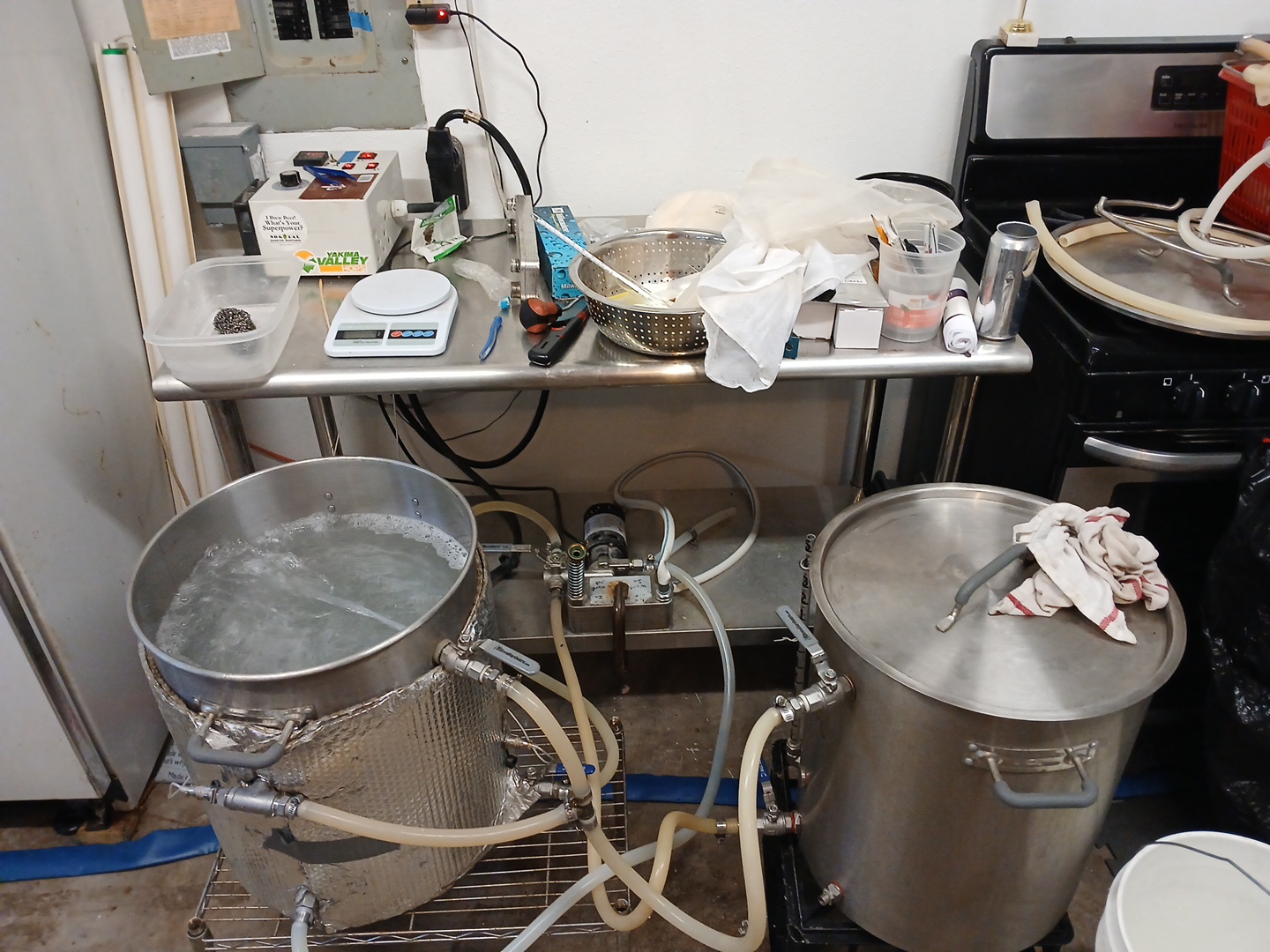 I've been wanting to get my system back up and running but my entire garage space has been a crapped-out mess. Since we decided to have a big party this year for the first time in a while (used to be an annual winter event), I knew that I needed to clean and organize so I could use the space for food prep and access to the tap-fridge. I had been figuring on just buying a few kegs to serve guests but once I had the garage cleared and a little organized, I couldn't help wanting to see if I could gear up and run a batch. Even though it's really short timing, I figured I'd either have a beer or two (or three or four) to serve or just resort to buying kegs so nothing to lose but the time and effort. The beers would be done eventually, one way or another.