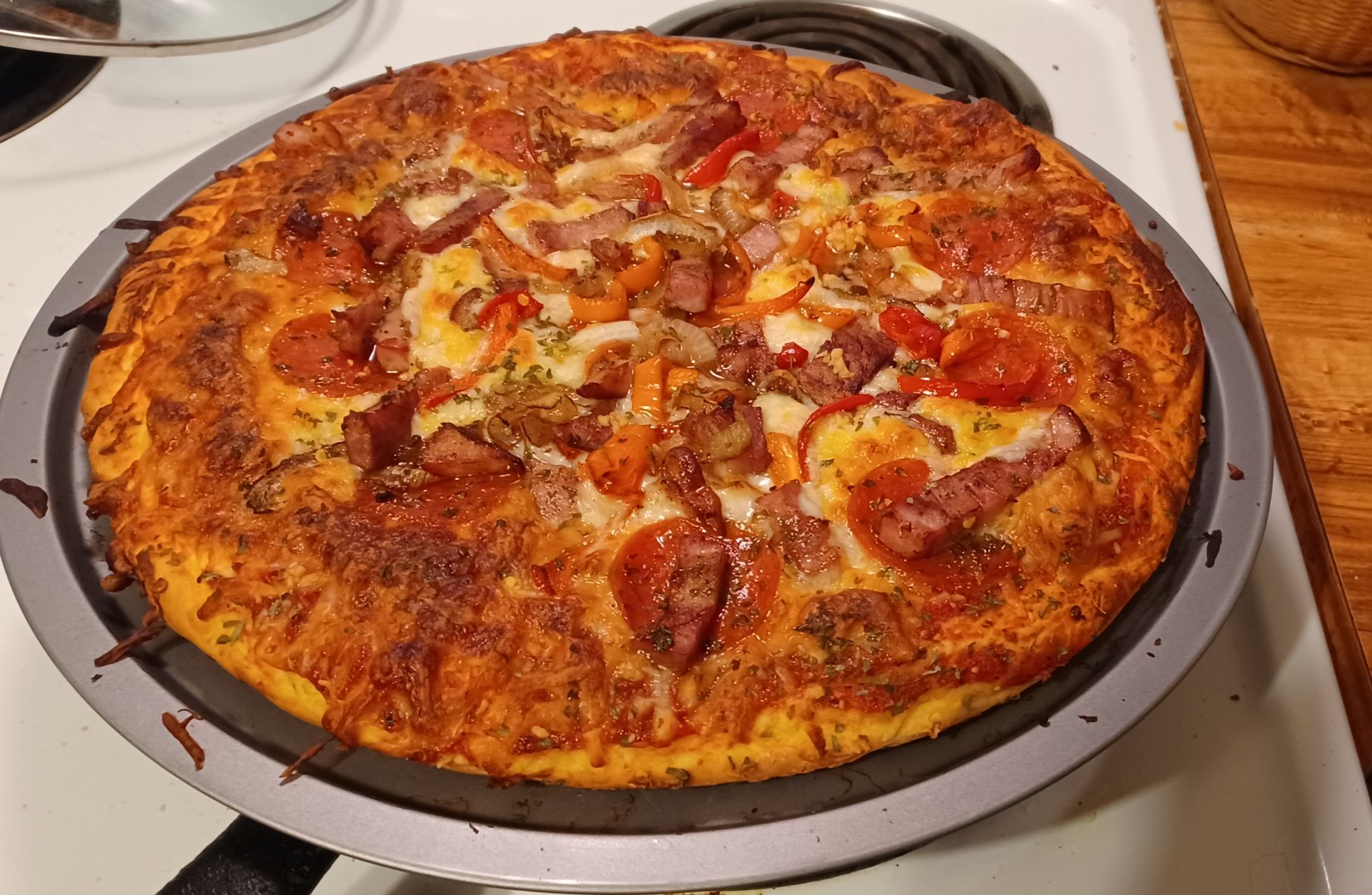 You make pepperoni?just so you guys know, I make most from scratch, meaning dough and sauce except the cheese, so ham, onions, peperoni, sweet peppers and lots of garlic in tis pie
