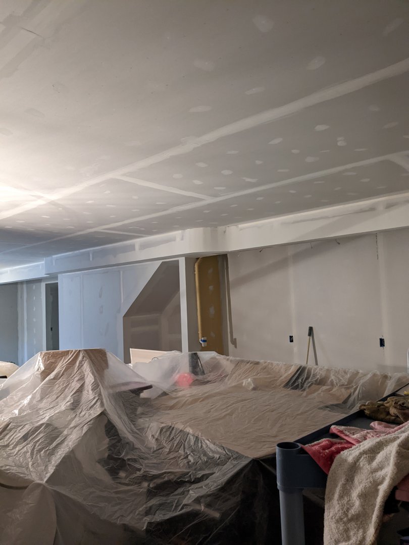 Easy: 1/4" drywall. Or thin plywood.Looks great! Especially the curve around the heat run (I assume). How the heck to you drywall a curve anyway?