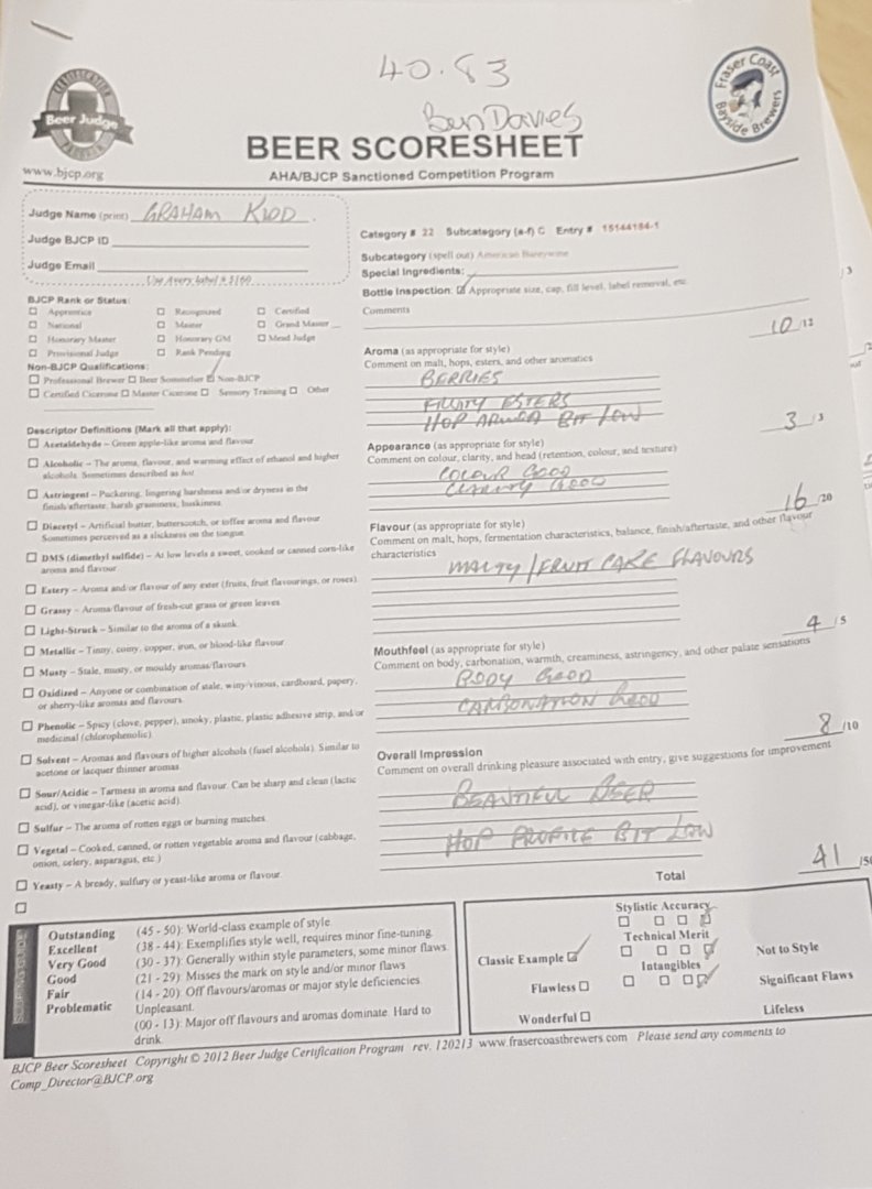 Averaged 40.8 so I'm chuffed with that they got some aroma and flavour notes berries raisins rich malt caramel fruit cake. None noted any oak flavor and all said hops a bit low on ballance.View attachment 6156