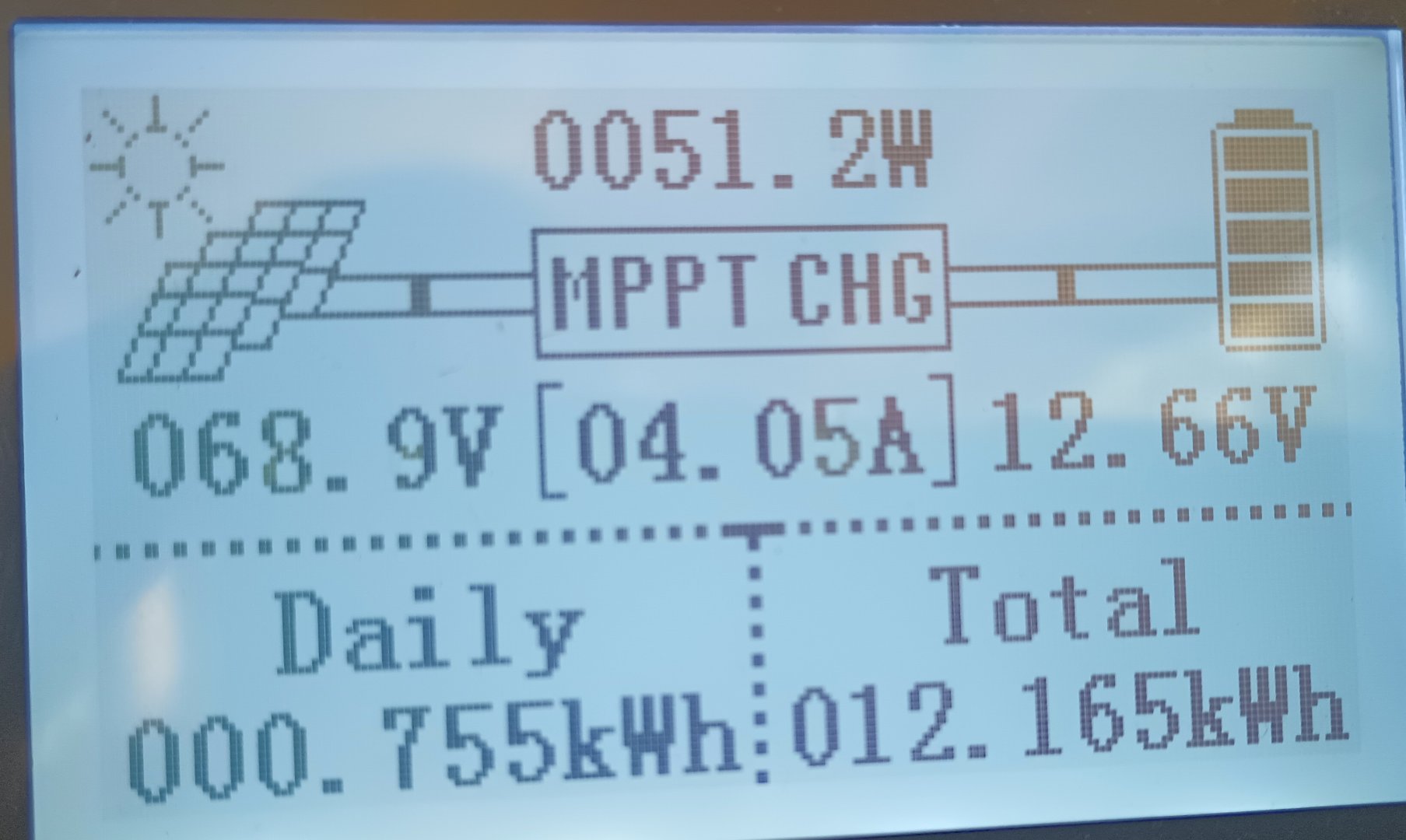 If I'm understanding that display your daily output from PV is 0.755 kWh. You said you're running stuff during the day off the inverter, with that you will not fully charge the battery bank.This is on the controller displayView attachment 25052