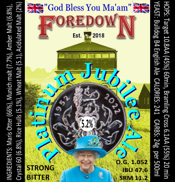 This year Her Majesty Queen Elizabeth II will have been our monarch for 70 years. From 1952 to 2022. I am going to make a Strong Bitter (5.2%) to toast her during celebrations later this spring - when it's ready to drink that is. I'm not going to wait for the Bank Holiday.