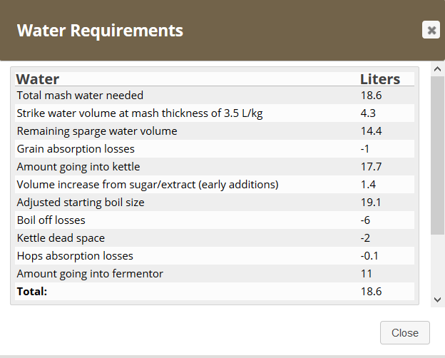 So I have a grain bill of 3.28kg and a starting mash thickness of 3.5L/kg. Why does the quick water requirements calculator tell me that my strike water is only 4.3L? This is on a grainfather system and the "strike" water should be closer to 11L. Cheers, Matt.