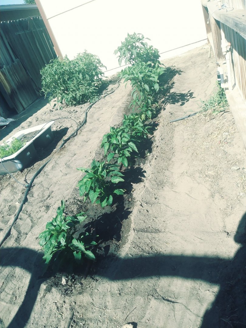 First a row of peppers. From closest, 3 Pimentos, 1 Anaheim, 2 Jalapeños, 1 Ancho and 2 Bells (mostly hidden behind the Ancho). Top left is a Cherokee Carbon tomato.