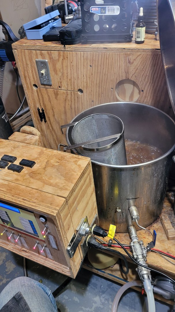 Herm’s Amber Ale is boiling, with hop spider holding the 60 minute bittering addition of Simcoe hops.