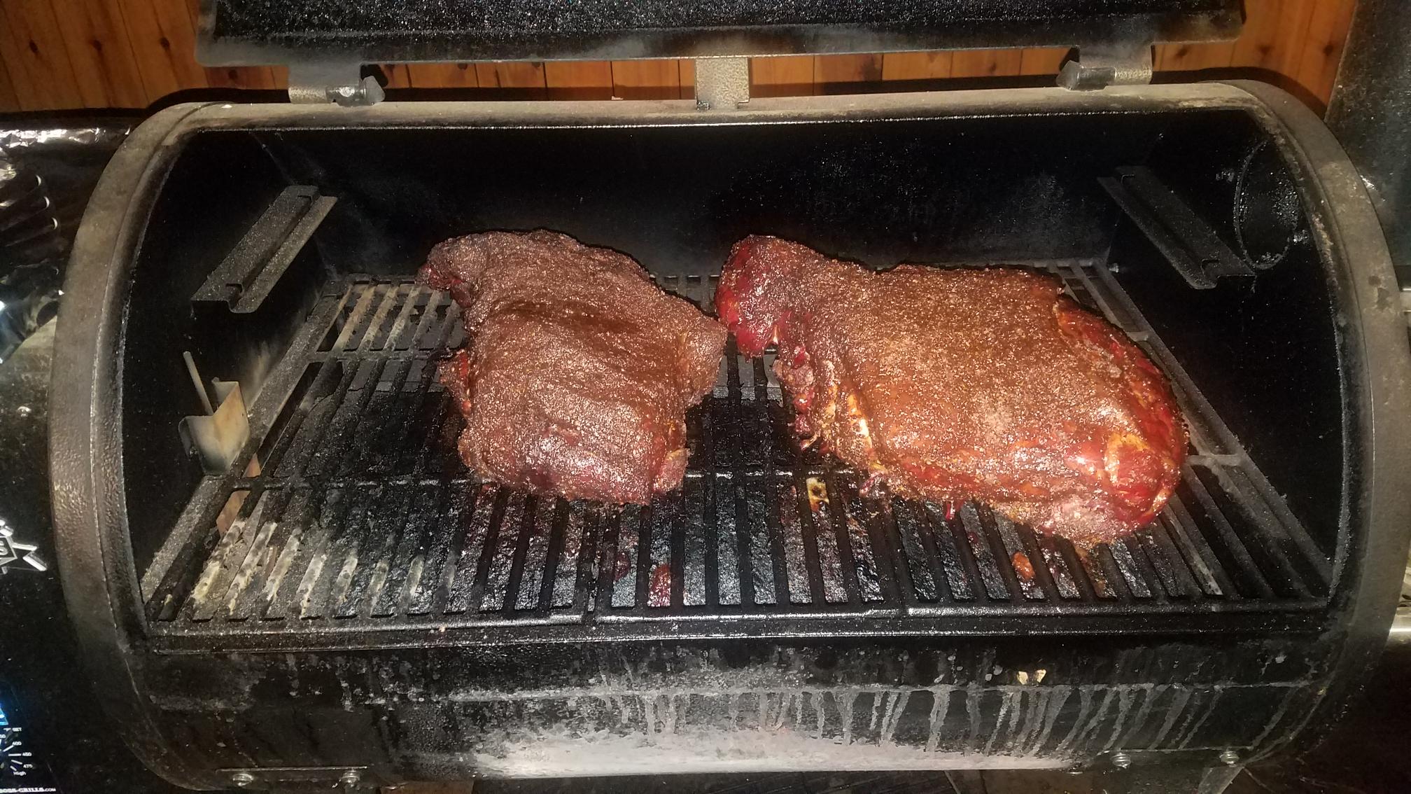 I'm up and ready for breakfast!19lb of pork butt on the smoker. I'll put them in foil when I wake up in the morning. Pulled pork for all (kids and friends)