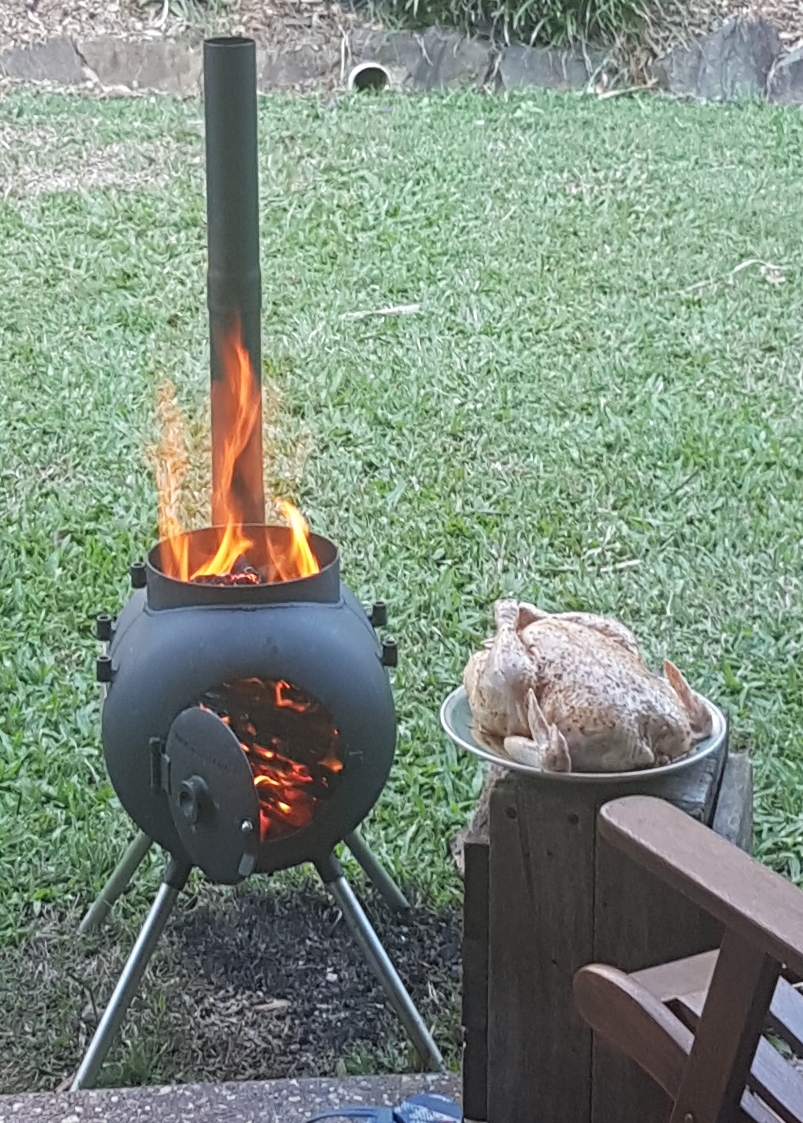right so got the fire on getting coals ready. chook is oiled salted and cajun rubbed and a lime quarted and stuffed in the clacker with legs scured together. let the roast begin!