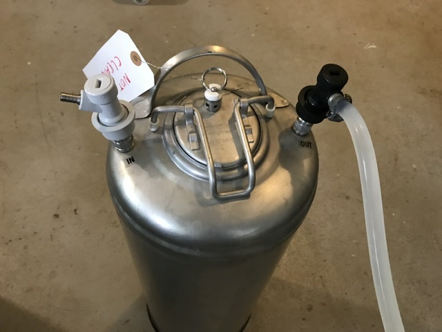 This is the keg to be filled: fill line on the right, exhaust on the left. The CO2 regulator is on the keg you are filling from. The pressure in the keg won't last long enough to pressure transfer all of it, you need to add some closer to the end of the process.View attachment 15837