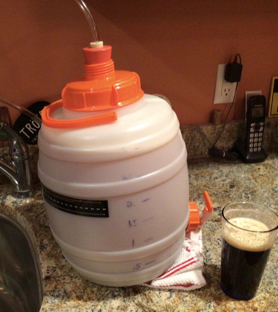 Brutal. The crazy shit we do to make our own beer. Be careful, man.Wish I could post a video. I have a very happy fermenter tonight. Boogiein’ along about 3 bubbles per second through the airlock. I don’t think I’ve ever seen a batch get this excited, especially with dry yeast. I’m really starting to like my Christmas present. My only reservation is that it’s very awkward to carry and the stand doesn’t follow (it isn’t attached) so I have to get the missus to bring the stand while I curl the handle I made for it. I have a sling for the glass carboy, which is a lot better than nothing, but I don’t think I’m tall enough to lift the conical into the stand with a sling, especially with the collection ball attached. So I made a rigid handle that bolts on where the wall mount studs go. Still, that bugger is heavy, without the added effort of 14 steps to climb. No plumbing downstairs, so not much choice about bringing it up for brewing and bottling.