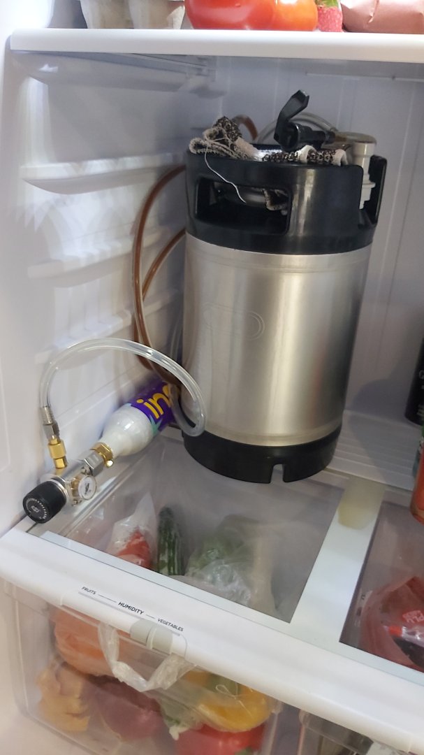 Hooked up at the trailer! Need a longer beer line, coming out pretty foamy! Maybe I will try reducing pressure first, the mini reg may not be all that accurate...