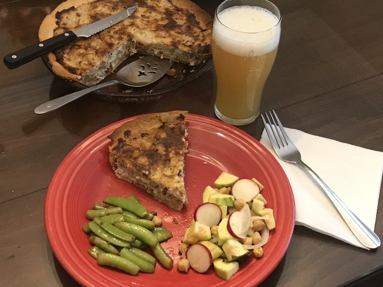 And a wheat beer?Onion pie (zwiebelkuchen), sauteed sugar snap peas, and a fresh salad.