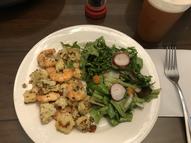 Yum great pairing!Grilled cauliflower with shrimp, garden salad & Hefeweitzen. The lettuce and radishes were picked just a few minutes ago.
